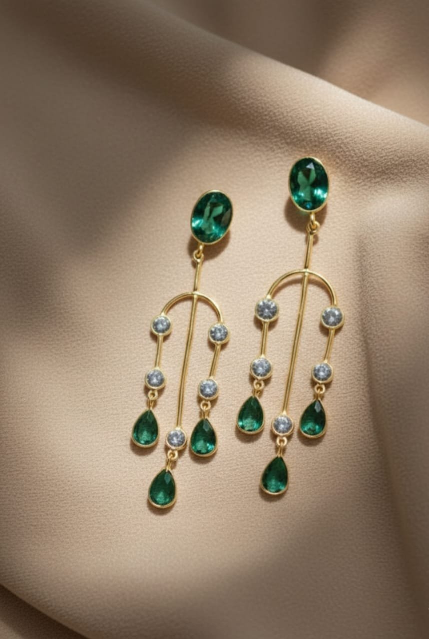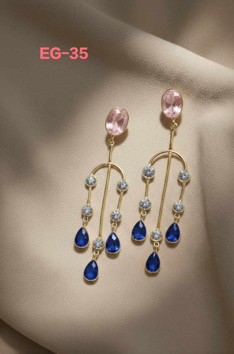 Add a refined touch of elegance to your look with our handcrafted brass dangler earrings from the EG–35 Collection. Designed with a modern artistic silhouette, these earrings feature a blend of oval and teardrop-cut stones in vibrant hues, complemented by sparkling white crystals that enhance their graceful charm.