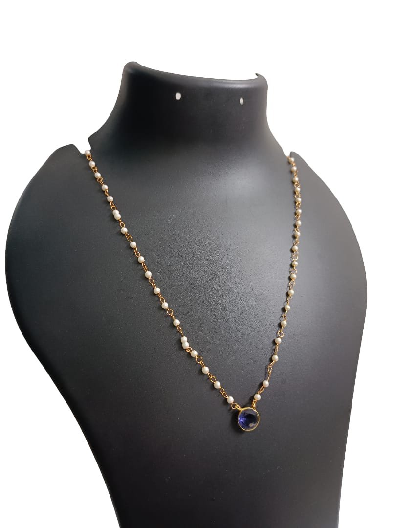 This exquisite pendant necklace blends timeless craftsmanship with natural beauty. Hand-crafted from lustrous mother-of-pearl (MOP) and warm gold-tone brass, it offers a radiant, organic appeal. The delicate chain is artfully linked with tiny pearl-like beads, giving it a graceful rhythm and subtle shimmer. At the center hangs a smooth, oval quartz stone, carefully polished to reveal its translucent depths and unique natural inclusions.
