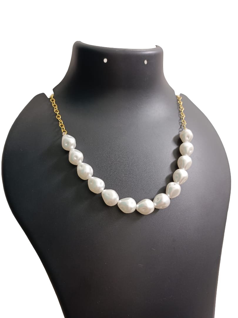 The necklace is designed with a graduated strand of organically shaped beads, highlighting the uniqueness of each piece—no two beads are identical, which adds to its charm. The pearls are carefully hand-knotted and attached to a gold-tone chain on each side, creating a perfect balance of classic and contemporary style.