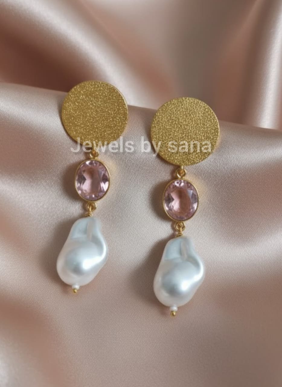 Add a touch of sophistication to your look with these stunning handcrafted earrings. Expertly made from high-quality brass, each piece features a textured golden disc that beautifully complements a deep ruby-red gemstone. The design is finished with a luxurious baroque pearl drop, adding elegance and timeless charm.