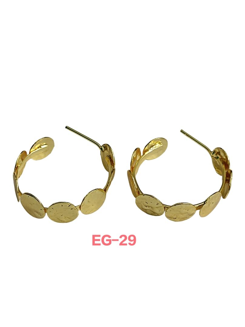 Add a touch of modern elegance to your jewelry collection with these uniquely designed EG-29 hoop earrings. Featuring a striking arrangement of textured golden discs, these earrings are perfect for both casual and formal occasions. Crafted from high-quality brass, they combine durability with a luxurious shine, offering a timeless accessory that enhances any outfit.